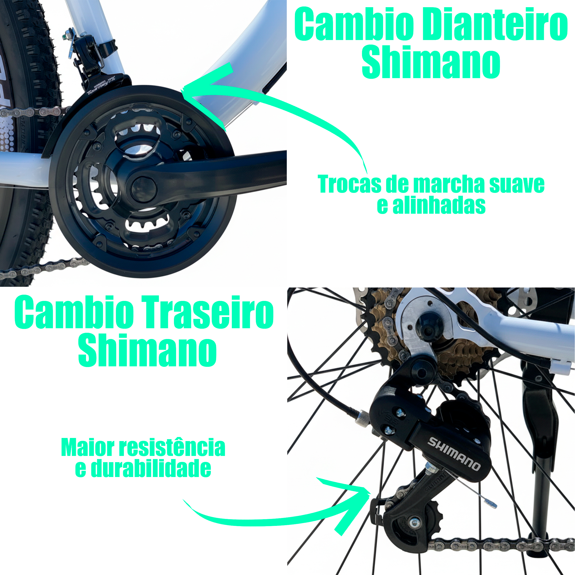 Transmissão Shimano 21 Marchas: Equipada com alavanca Rapid Fire, câmbios Shimano indexados e roda livre de 7 velocidades, a bicicleta oferece 21 marchas para você enfrentar subidas, planos e descidas com facilidade.