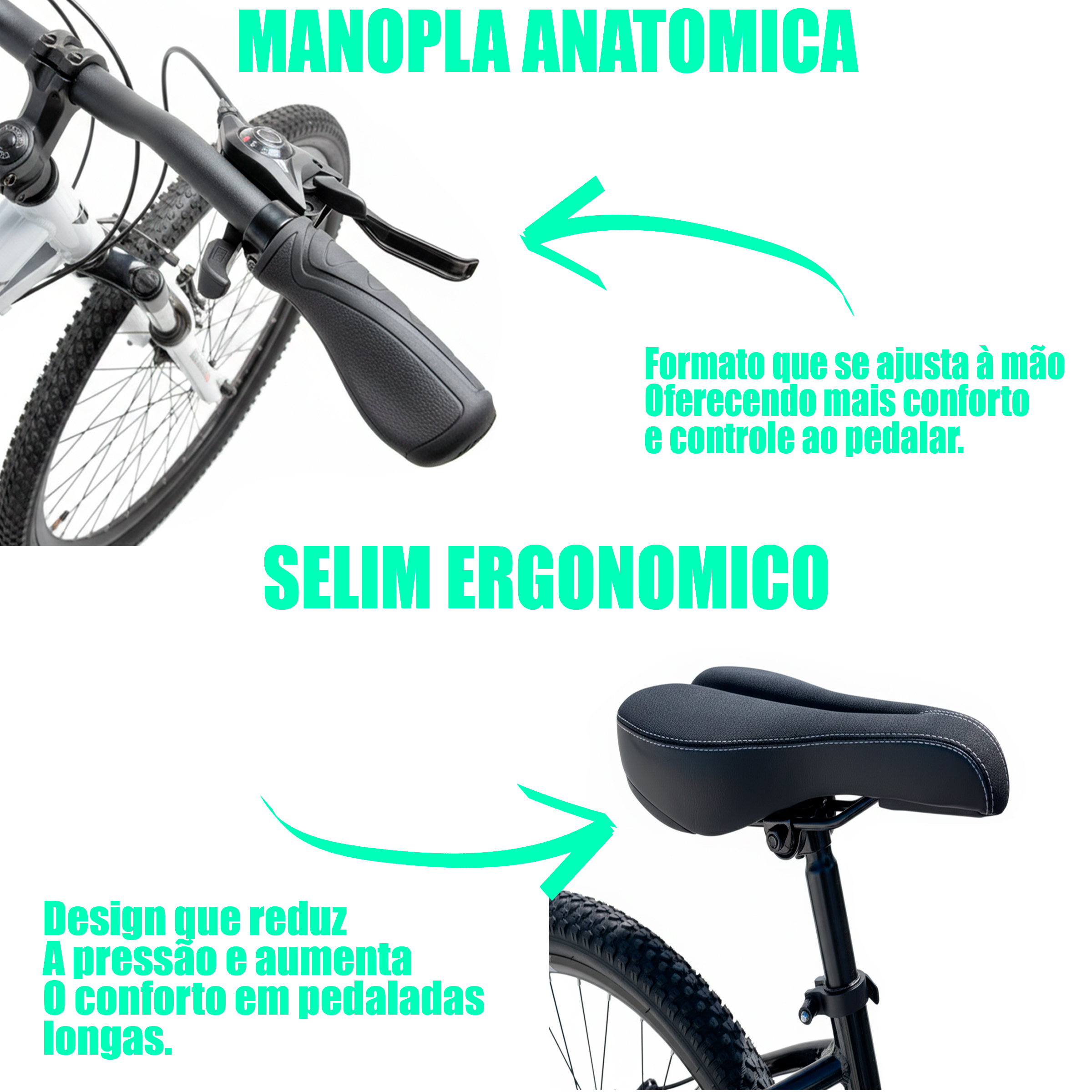 Freios a Disco Mecânicos: Os freios a disco mecânicos oferecem uma frenagem eficiente e segura em diversas condições climáticas, dando a você mais controle sobre a bicicleta.